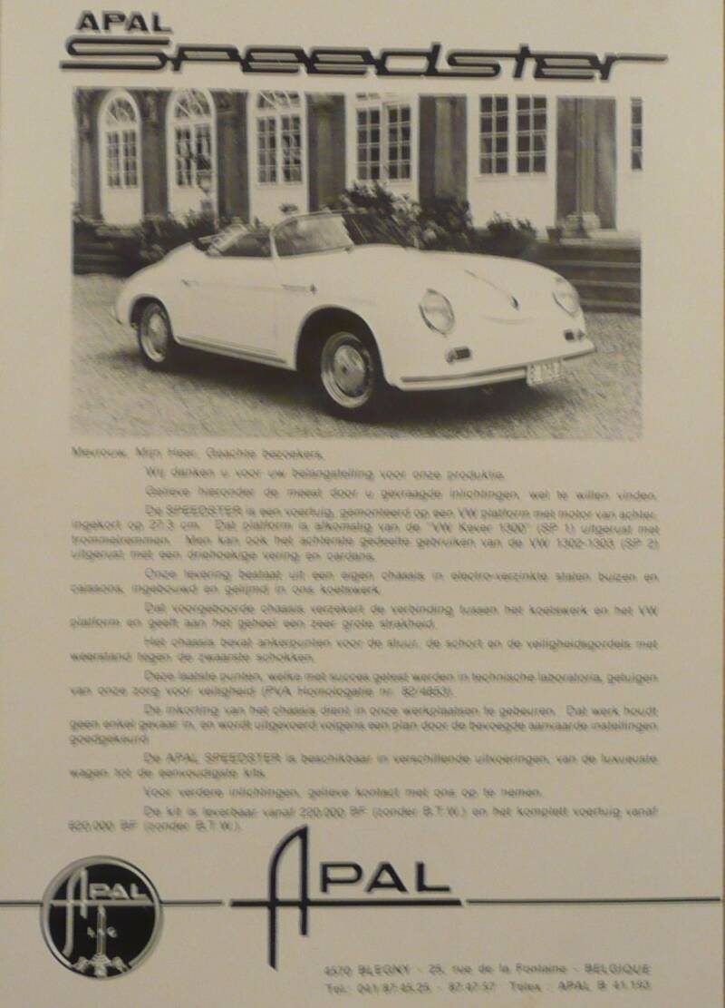 Van 1981 tot 1998 produceerde Apal de Speedster, een replica van de Porsche 356 Speedster. Opnieuw een wagen gebouwd op een ingekort Kever-chassis. Er werden circa 700 Speedsters verkocht. Met het stoppen van de productie van de Speedster kwam bij Apal definitief een eind aan de autoproductie.