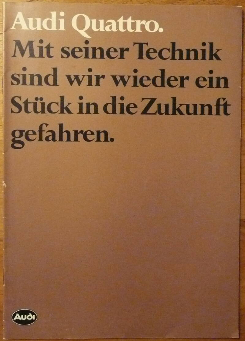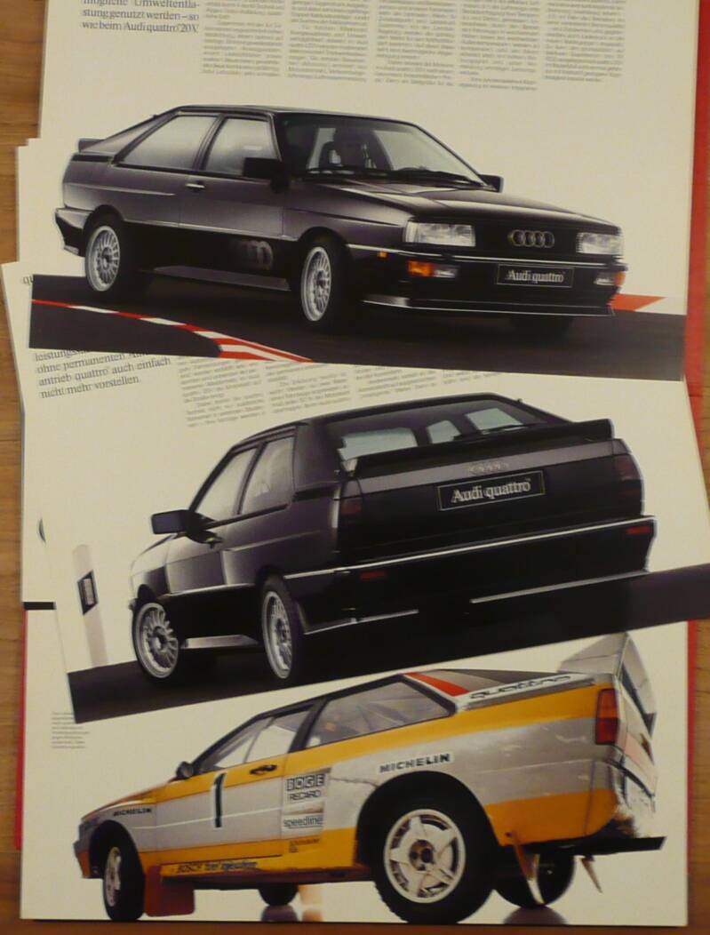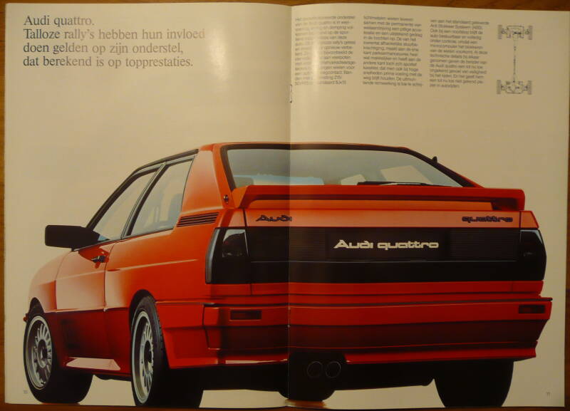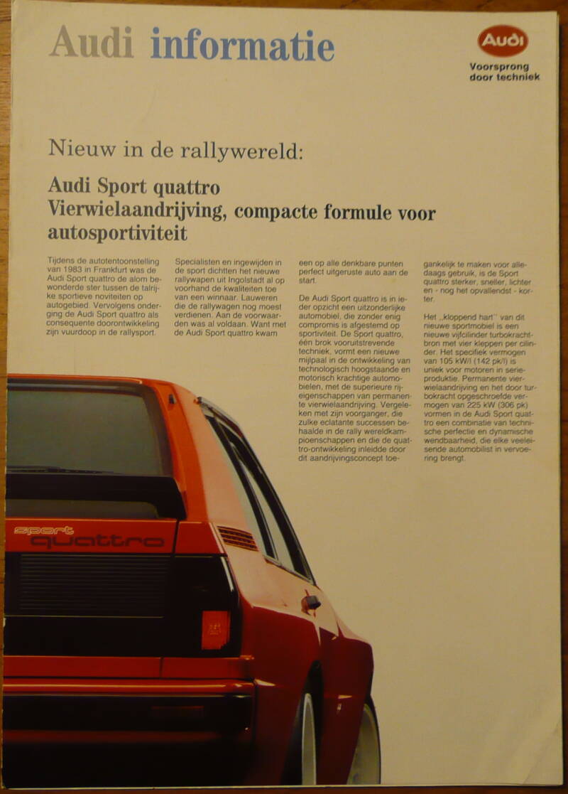 Een Nederlandstalige brochure van de Audi Sport quattro met 8 pagina's. Uitgifte datum 1983. Dit was een quattro uitvoering met ingekorte wielbasis. Deze was speciaal voor de Rally sport ontwikkeld. Er zijn enkele straat versies gemaakt.