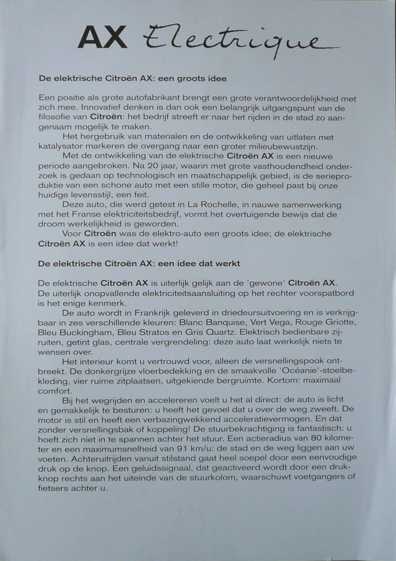 Een Nederlandstalige leaflet over de AX Electrique. Uitgifte datum is niet bekent, zo rond 1995.