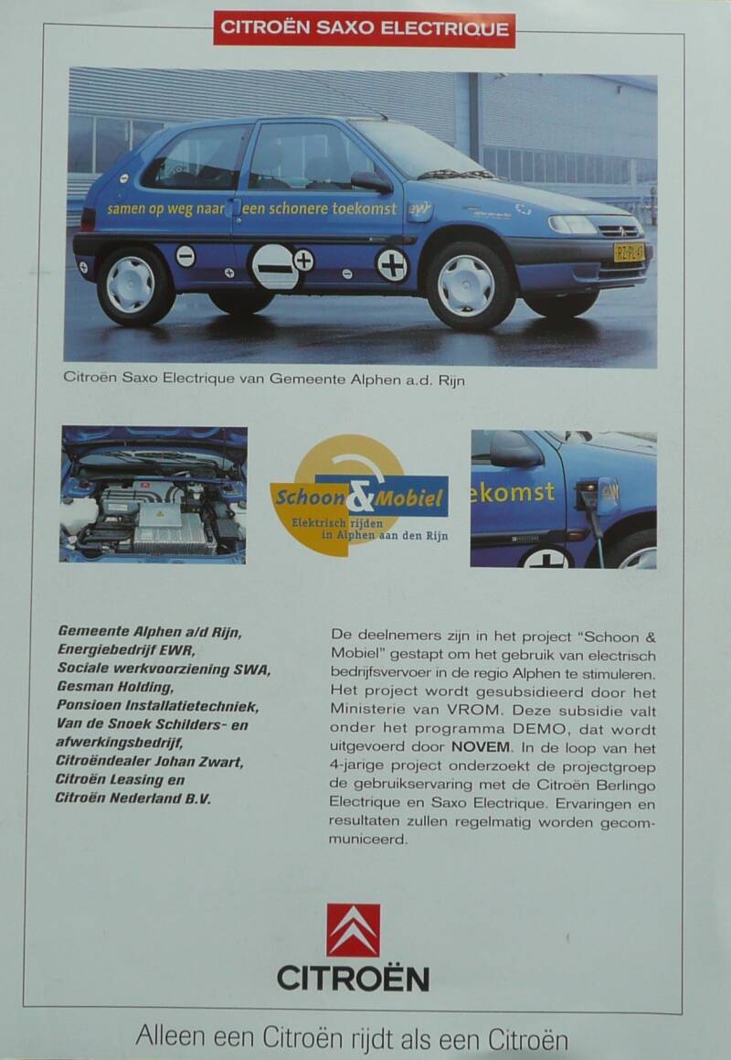 Een Nederlandstalige leaflet van de Saxo Electrique. Uitgifte datum 01-1999.