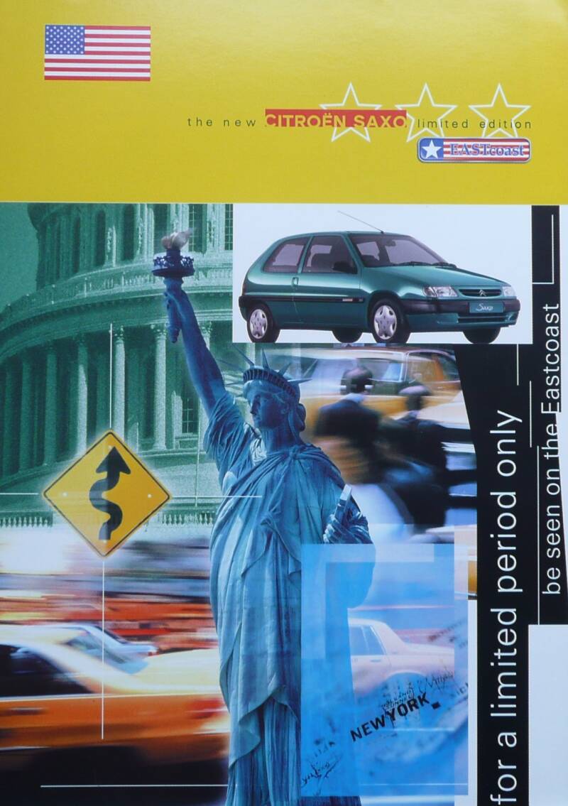 Een Engelstalige brochure van 4 pagina's uit Engeland. Uitgifte datum 10-1998. Beschrijft de Saxo Eastcoast.