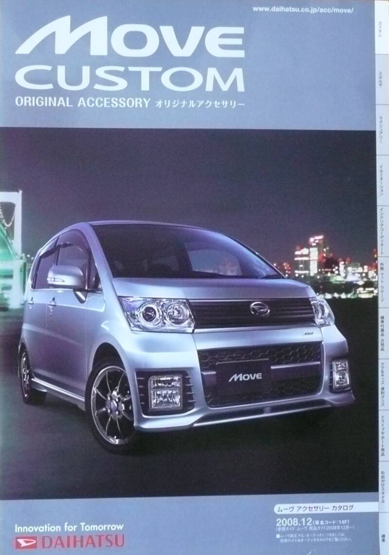 Een Japanse brochure met 24 pagina's. Uitgifte datum 12-2008. Soort modellenprogramma met accessoires van verschillende Move Custom modellen.