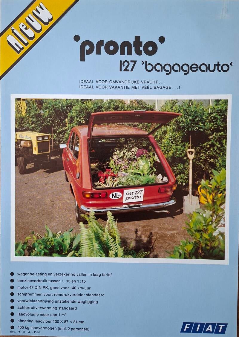 Een Nederlandstalige leaflet. Uitgifte datum 11-1974. Beschrijft de 127 Pronto.