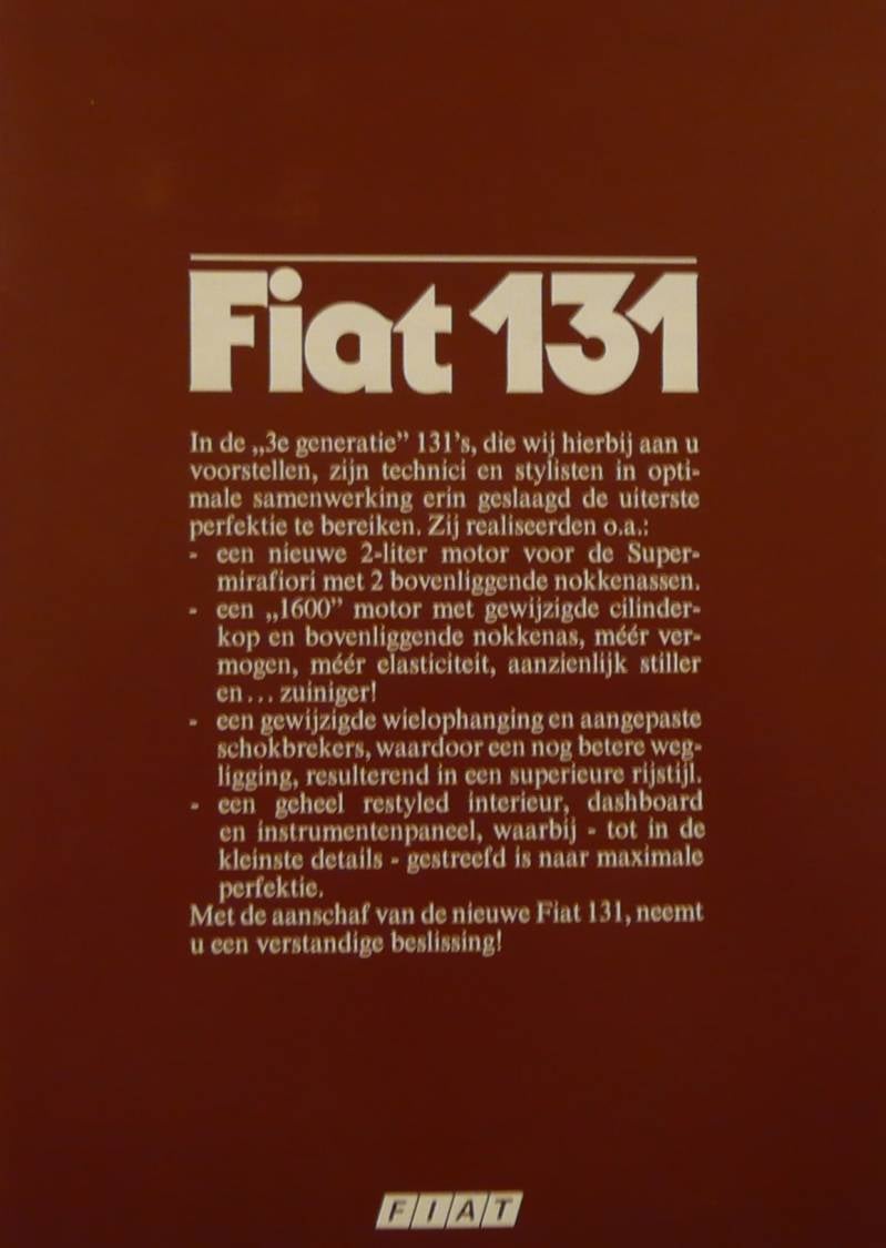 Een Nederlandstalige brochure met 16 pagina's. Uitgifte datum is niet bekent, zo rond 1977. Beschrijft de 131 Mirafiori en de Supermirafiori.
