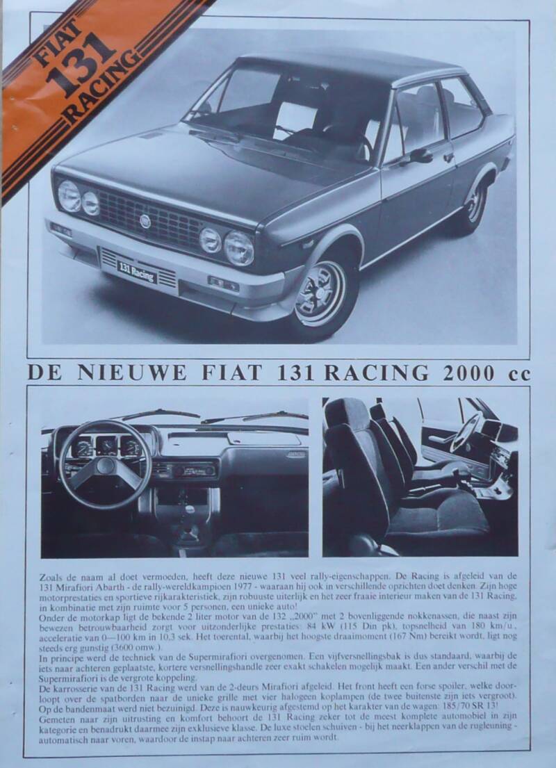 Een Nederlandstalige leaflet. Uitgifte datum 07-1979. Beschrijft de 131 Racing.