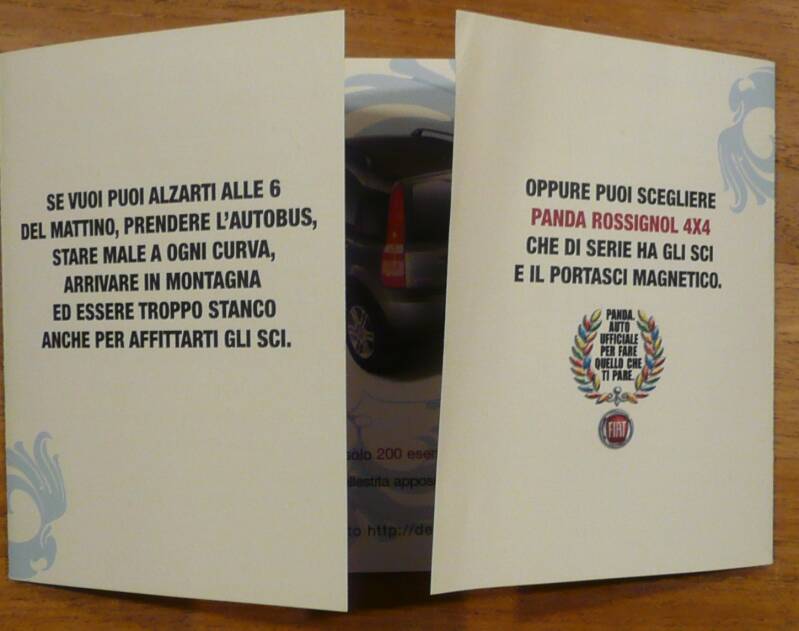 Een Italiaanse brochure met 4 pagina's. Uitgifte datum niet bekent. Beschrijft de Panda 4x4 Rossignol.