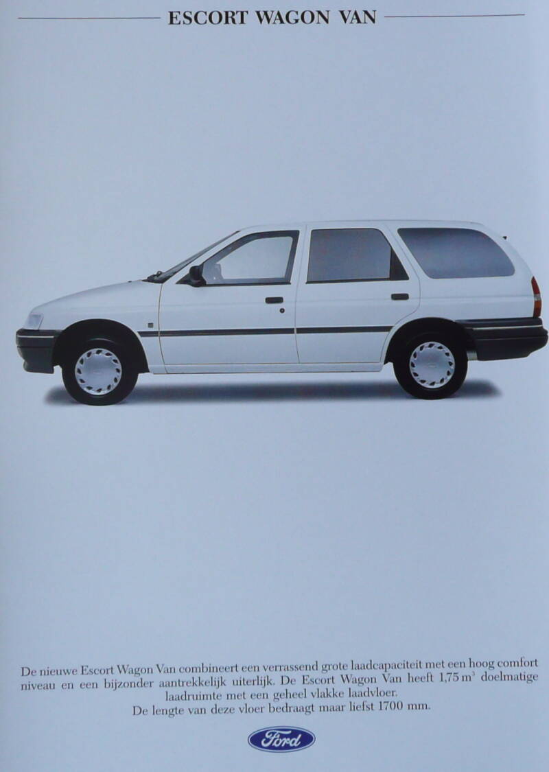 Een Nederlandstalige leaflet. Uitgifte datum 12-1991. Beschrijft de Escort Wagon Van.