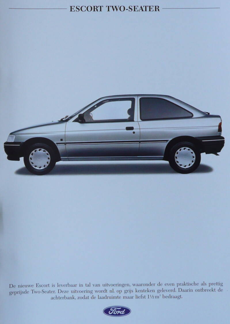 Een Nederlandstalige leaflet. Uitgifte datum 12-1991. Beschrijft de Escort Two-Seater.