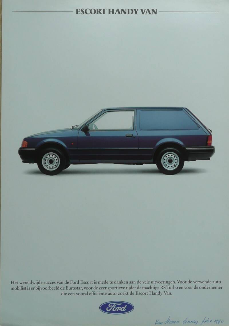 Een Nederlandstalige leaflet. Uitgifte datum niet bekent, zo rond 1990. Beschrijft de Escort Handy Van.