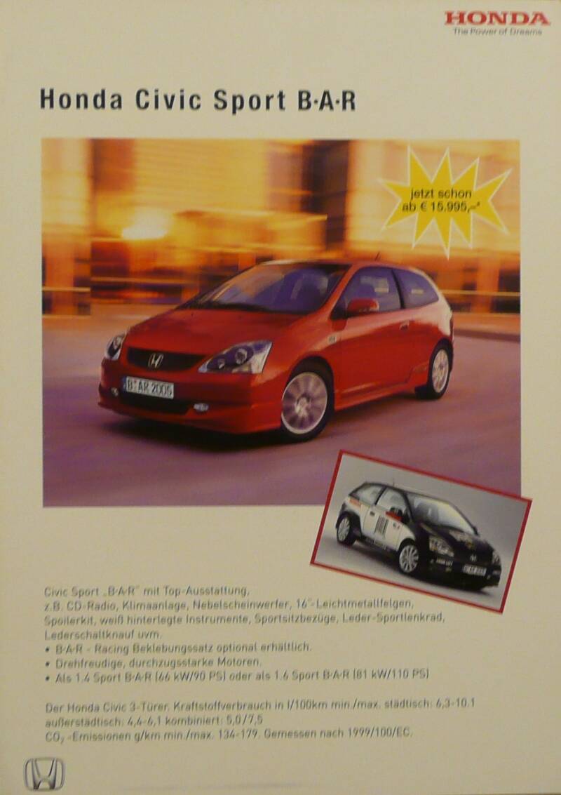 Een Duitstalige leaflet. Uitgifte datum 04-2005. Beschrijft de Civic Sport B-A-R.