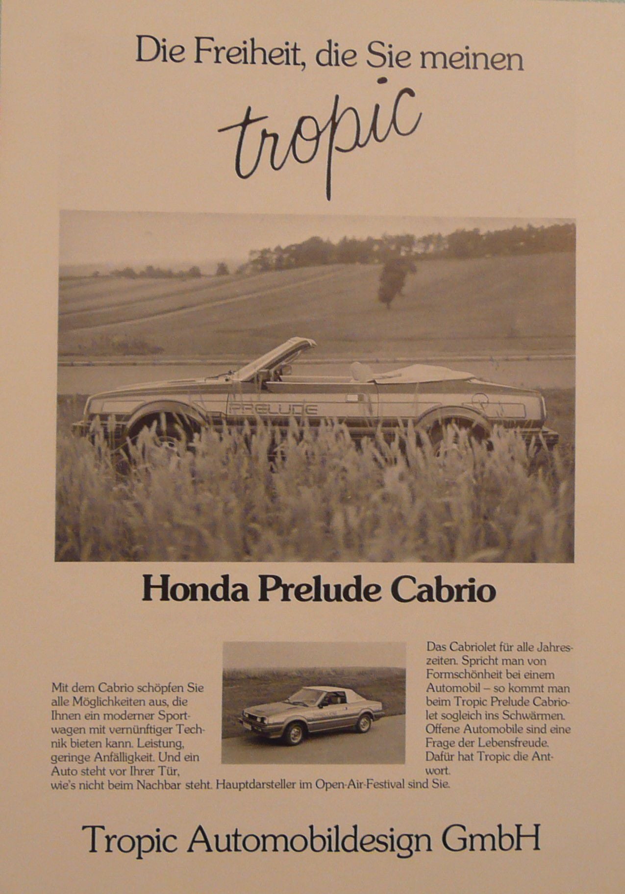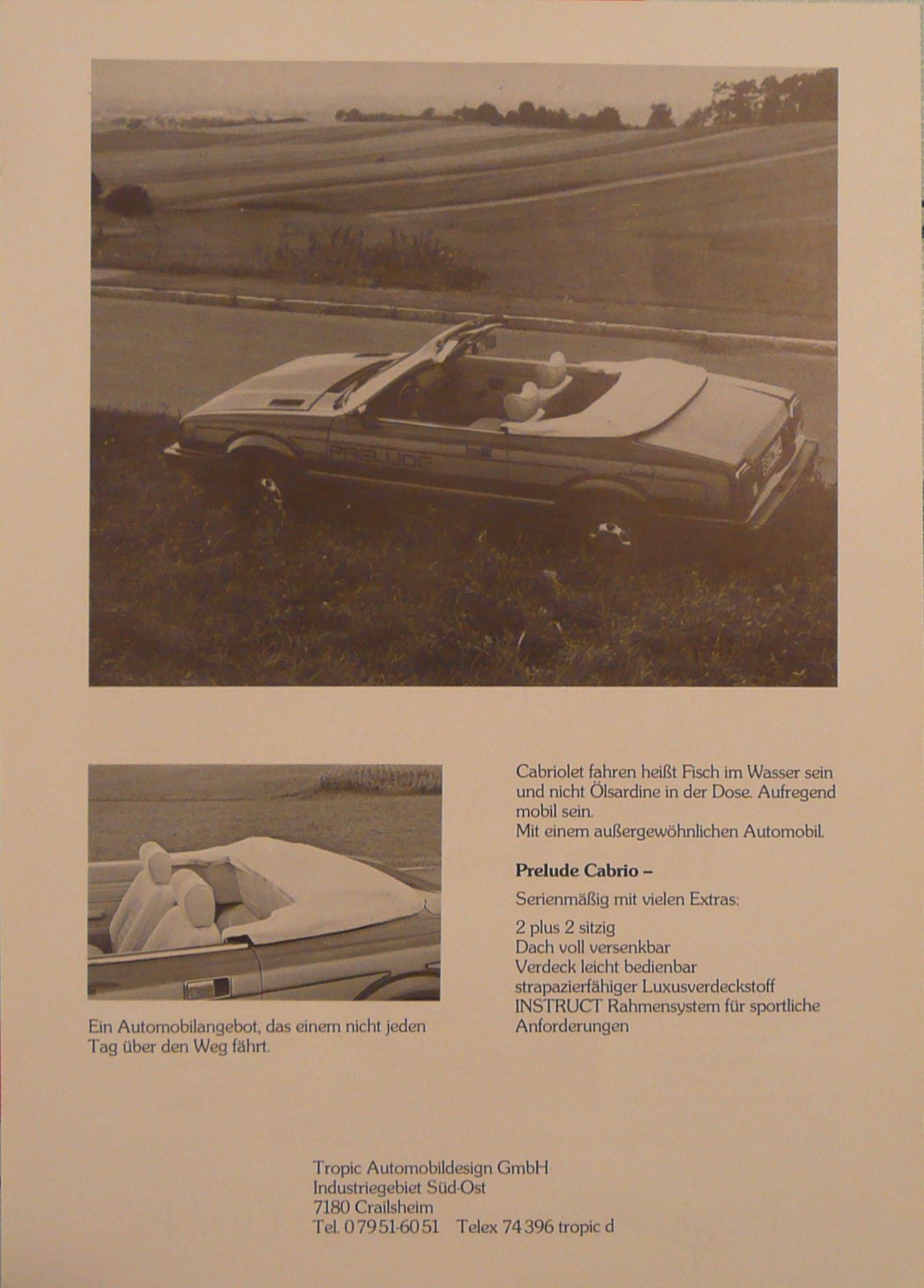 Een Duitstalige leaflet van de Prelude Cabrio van Tropic. Uitgifte datum niet bekent, ongeveer 1983?