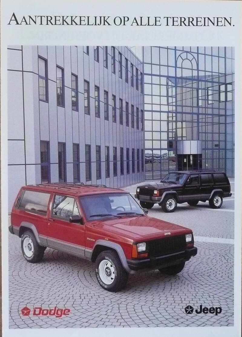 Een Nederlandstalige brochure met 24 pagina's. Uitgifte datum is niet bekent. Beschrijft de Jeep Cherokee en Wrangler (+-1990)