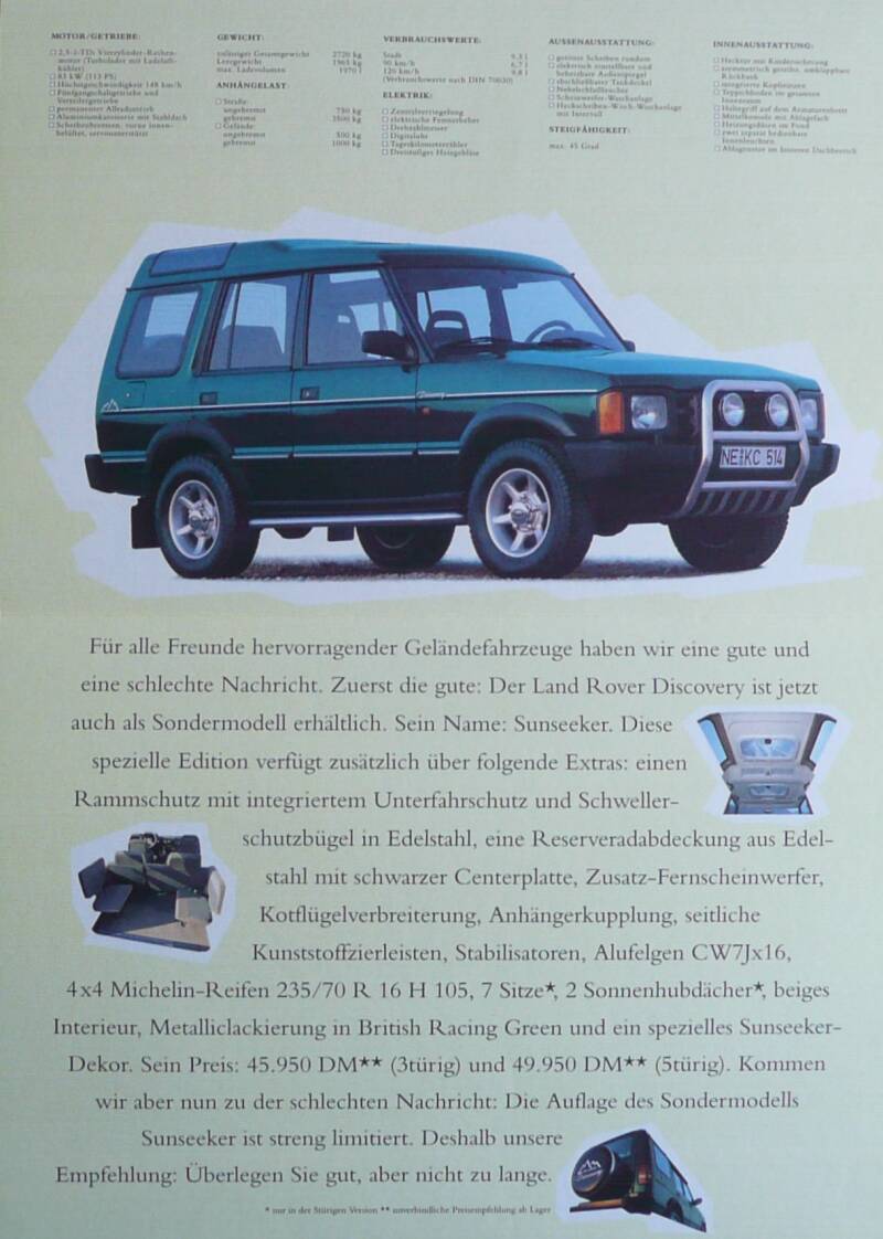 Een Duitstalige brochure met 4 pagina's. Uitgifte datum 06-1993. Beschrijft de Discovery Sunseeker.