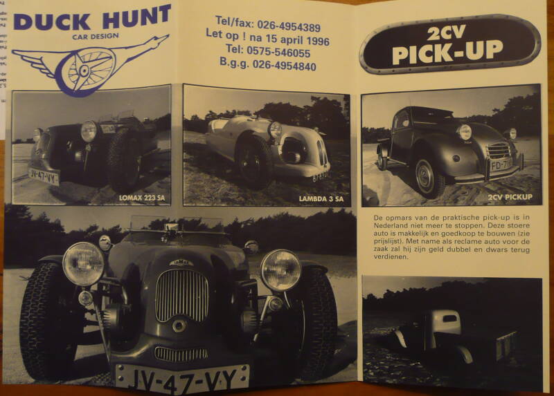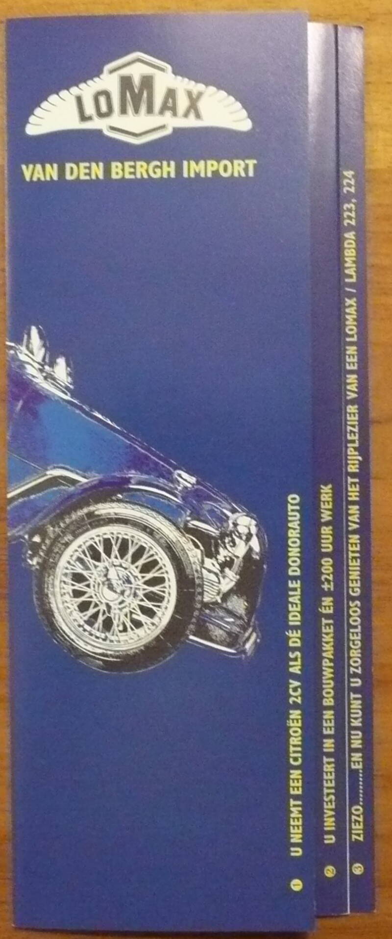 Lomax is een Nederlandse Kitcar fabrikant. Ze maken verschillende modellen op basis van de Citroen 2CV. Er is zelfs een 3 wheeler uitvoering. Hieronder enkele brochures/leaflets van het merk. Ze zijn alle in het Nederlands en zijn uitgegeven zo rond 1995-1996.