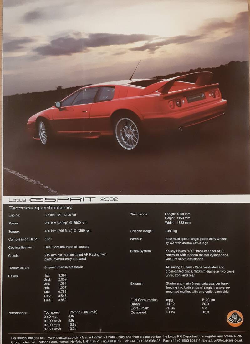 Een Engelstalige brochure met 16 pagina's die de Esprit V8 beschrijft. Uitgifte datum niet bekent, zo rond 2003.