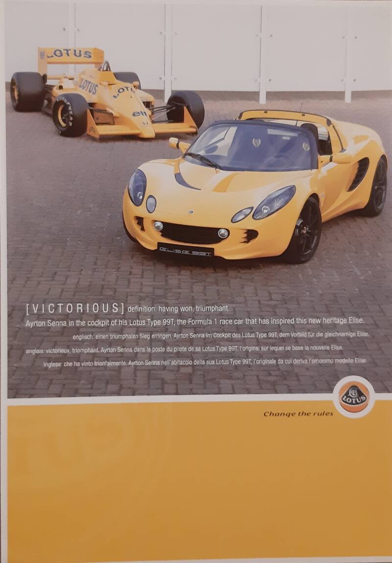 Een meertalige leaflet van de Lotus Elise Type 99T. Een special model naar aanleiding van het F1 model waar Ayrton Senna in reed. Uitgifte datum niet bekent.