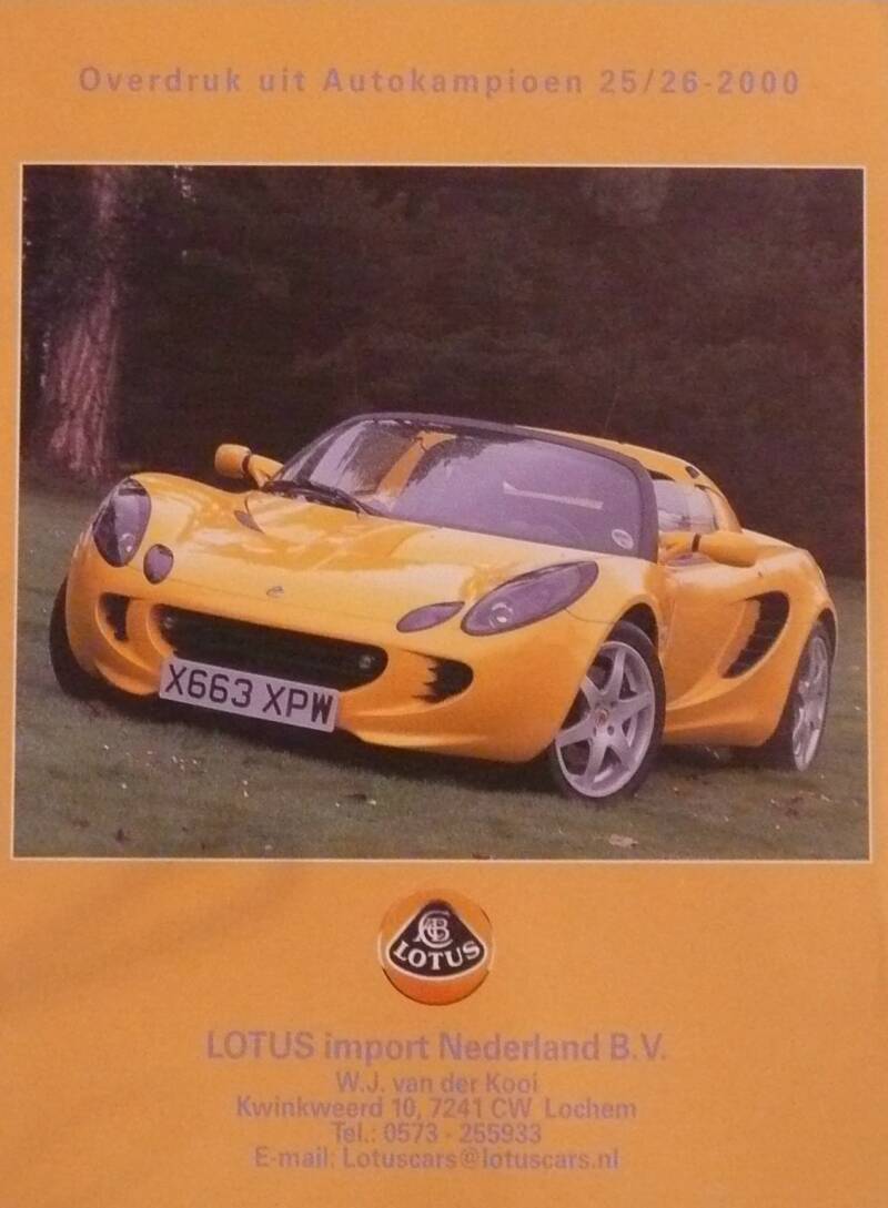 Een Nederlandstalige brochure met 8 pagina's. Uitgifte datum 2001? Test verslag van de Autokampioen. Uitgegeven door Lotus NL.