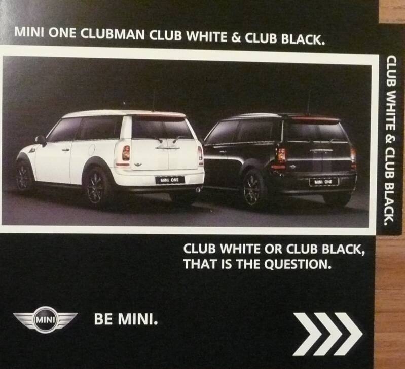 Een Nederlandstalige leaflet van de Mini One Clubman Club White & Club Black. Uitgifte datum niet bekent.