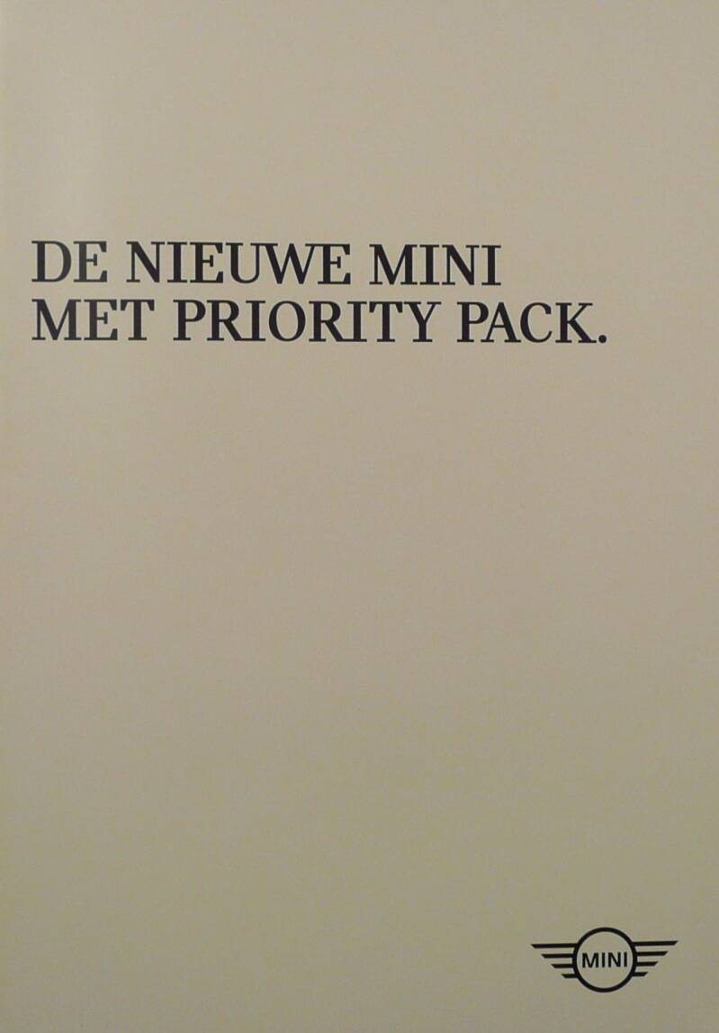 Een Nederlandstalige brochure met 30 pagina's. Uitgifte datum niet bekent. Beschrijft de Mini met Priority Pack. A3 formaat.
