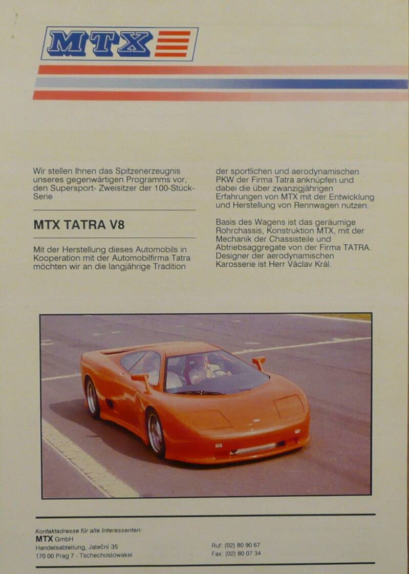 De MTX Tatra V8 is een supercar die gemaakt werd door MTX in samenwerking met Tatra in 1991. De MTX Tatra V8 is ontworpen door de Tsjechische automobielontwerper Václav Král en was in die tijd de snelste Tsjechische auto. Hij had de luchtgekoelde V8-motor van de Tatra 613-4, die echter werd opgeboord tot 3,9 liter en was uitgerust met carburateurs of een Bosch K-Jetronic. Het motorvermogen was 218-306 pk. Van 0 tot 100 km/u werd tussen de 5,6 en 6,2 seconden opgegeven. De top snelheid was 265 km/u.